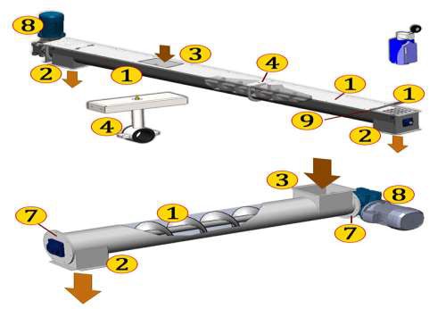 Sistemi di trasporto a coclea, questi sistemi sono realizzati su specifica del cliente, ed adatto per trasporti a basse velocità e portate elevate, è costituito da un elicoide che, ruotando sul proprio asse esercita una componente di spinta assiale sul materiale contenuto nel tubo convogliatore.